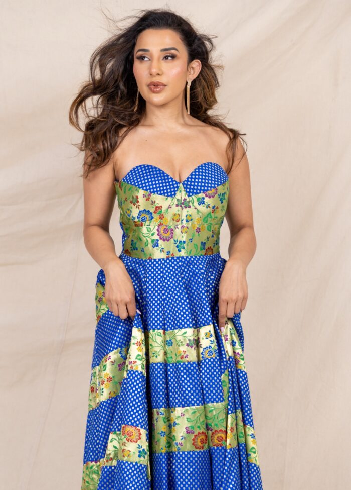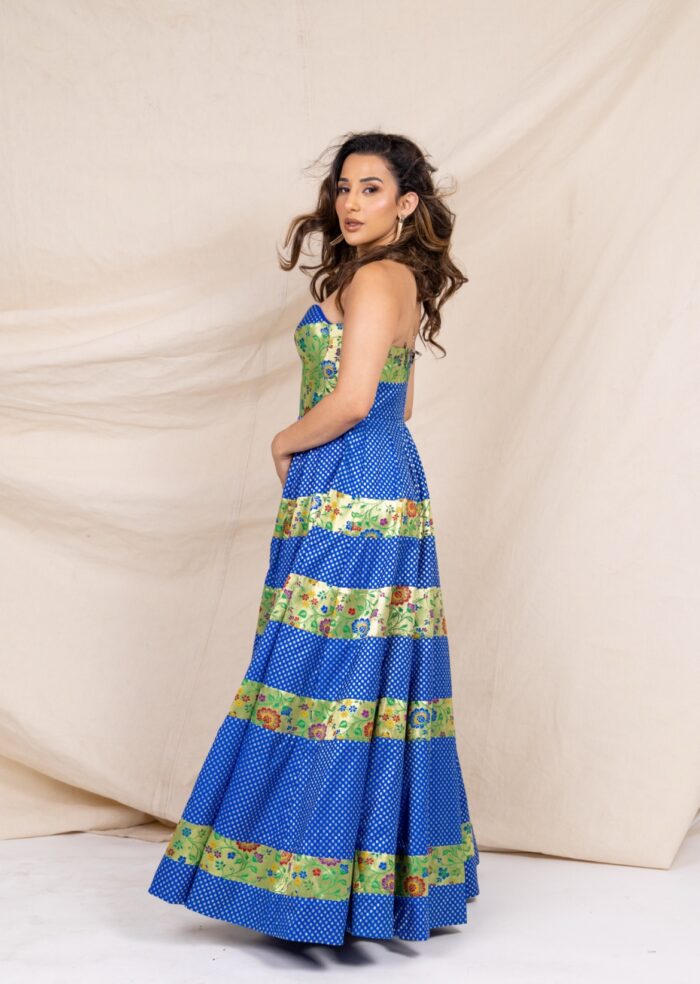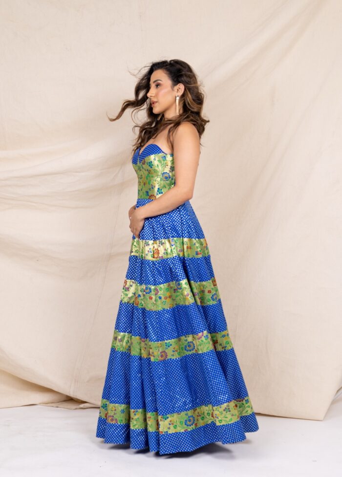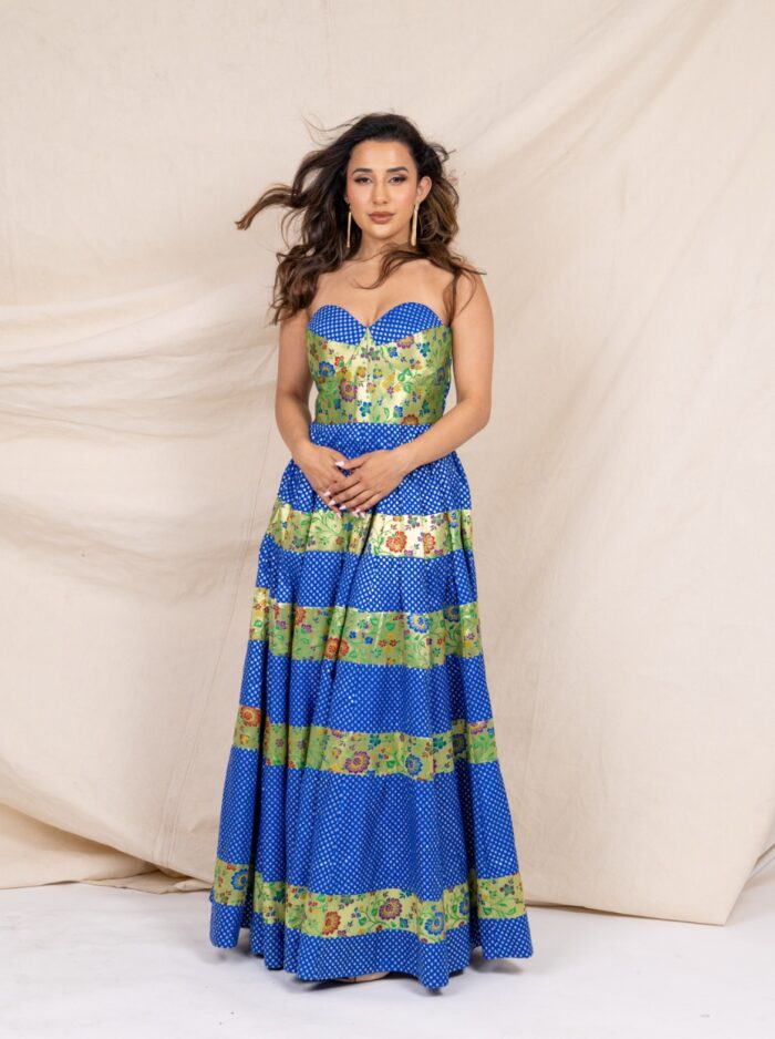 Banarasi silk with the elegance of a modern western silhouette. A true statement piece that radiates luxury, tradition, and contemporary charm.