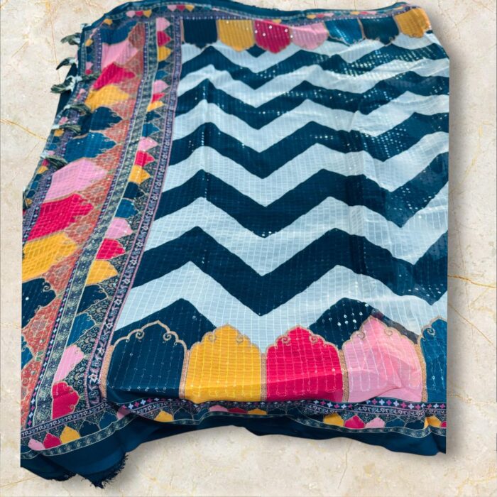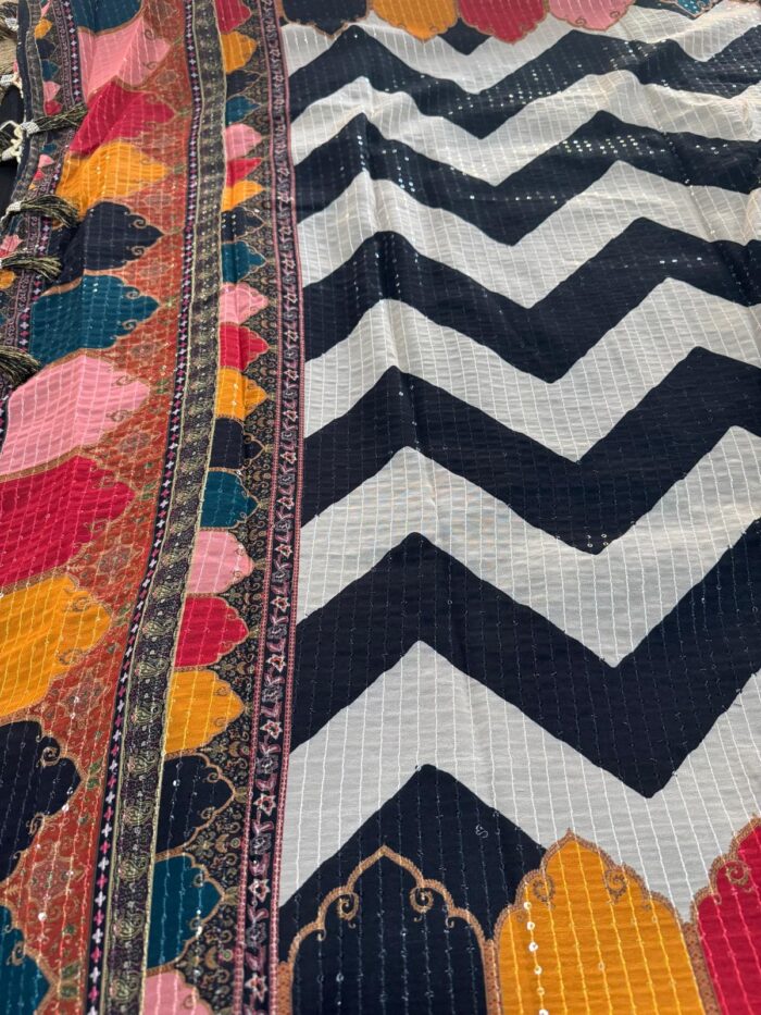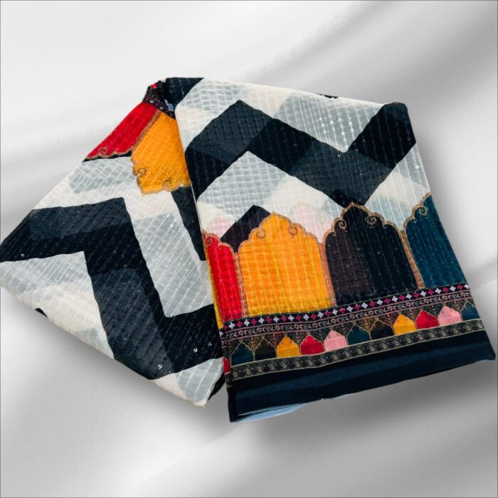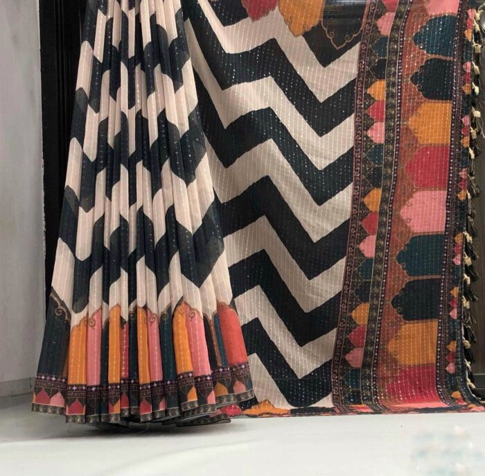 This black and white striped georgette saree is a stylish fusion of classic design and contemporary elegance. The bold stripes create a striking visual appeal, while the lightweight georgette fabric ensures a comfortable and graceful drape. Perfect for both casual outings and formal events, this saree exudes a chic and modern vibe. Pair it with a sleek blouse and minimal accessories to make a stunning statement. Its timeless black and white combination makes it versatile and easy to style for any occasion.