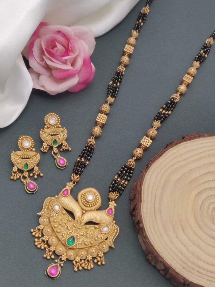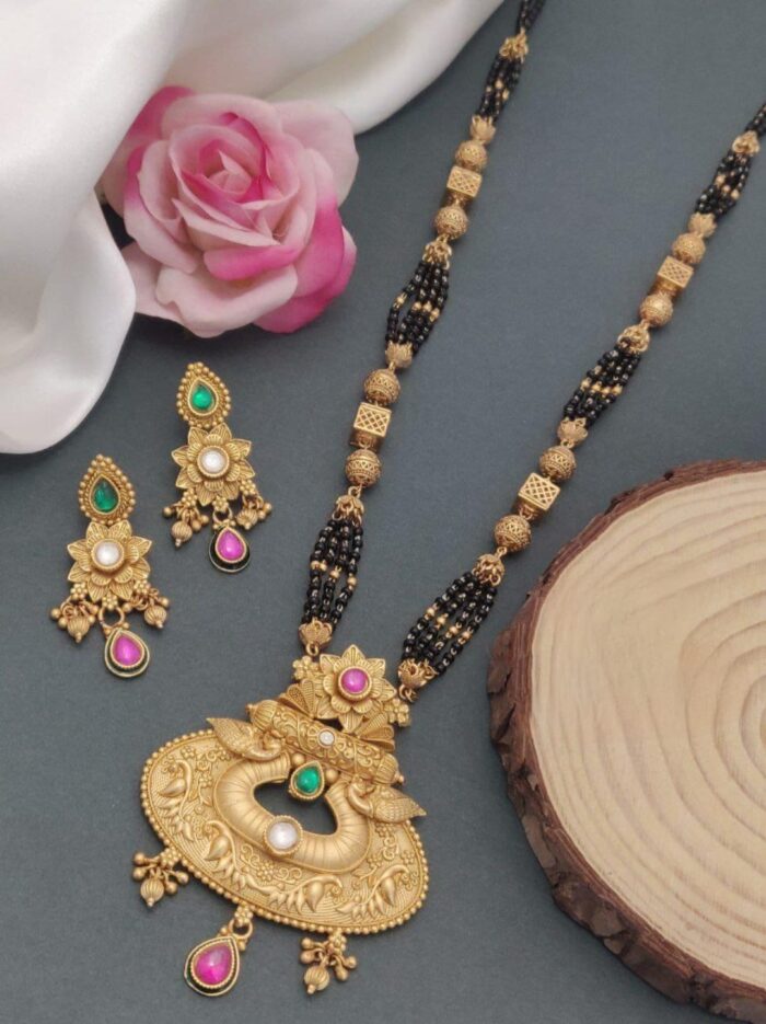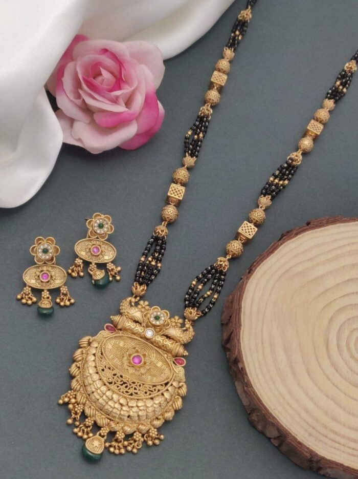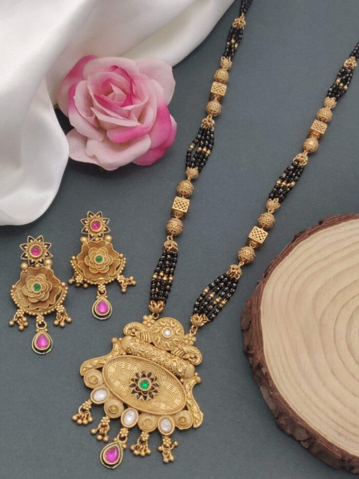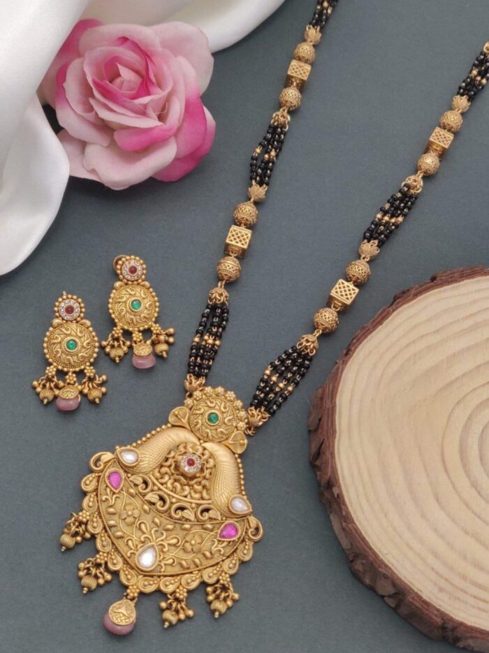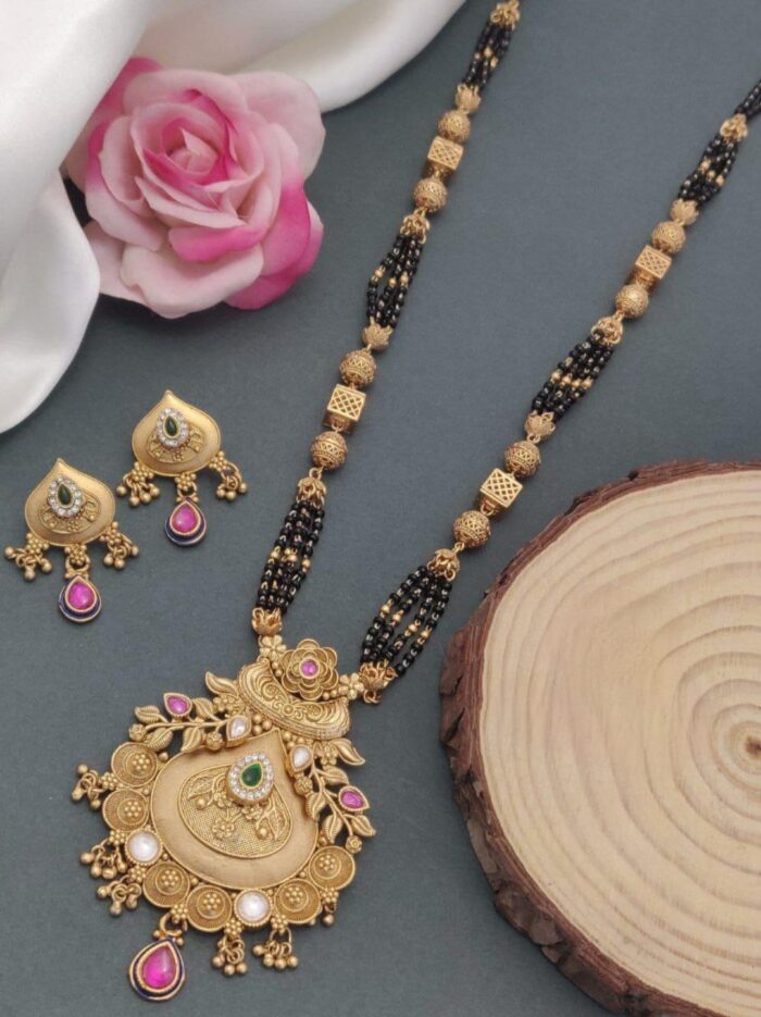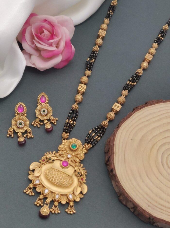 A black mangal sutra is a traditional necklace worn by married women in Hindu culture, symbolizing marital commitment. It typically features black beads strung alongside gold or silver elements. The black beads are believed to protect the marriage from evil influences, while the gold or diamond pendant at the center adds elegance and status to the design.