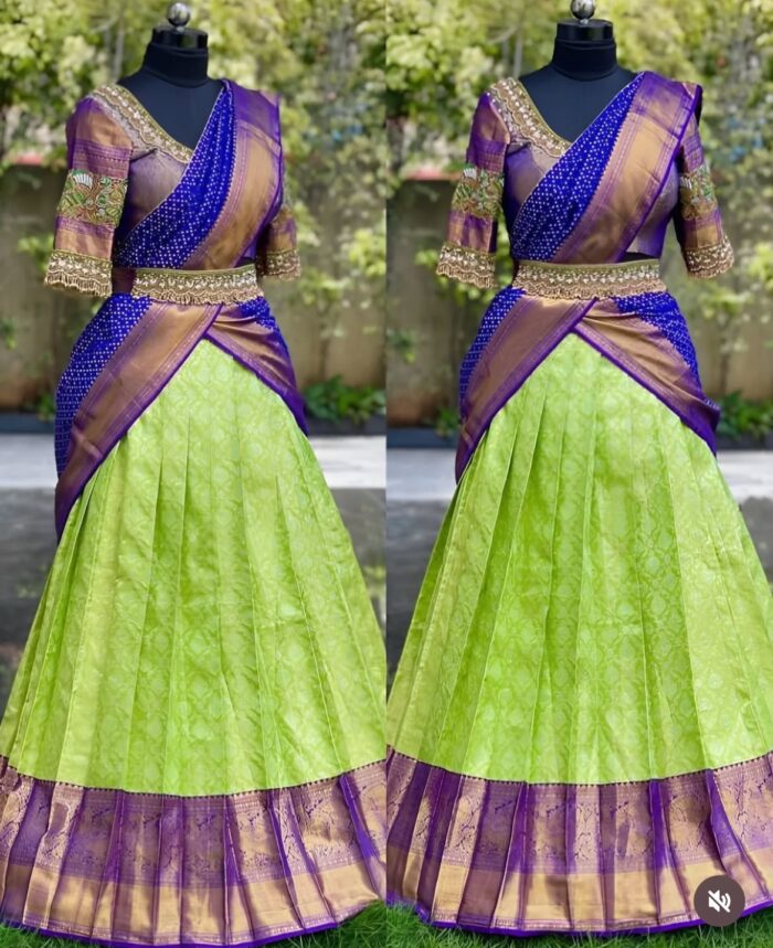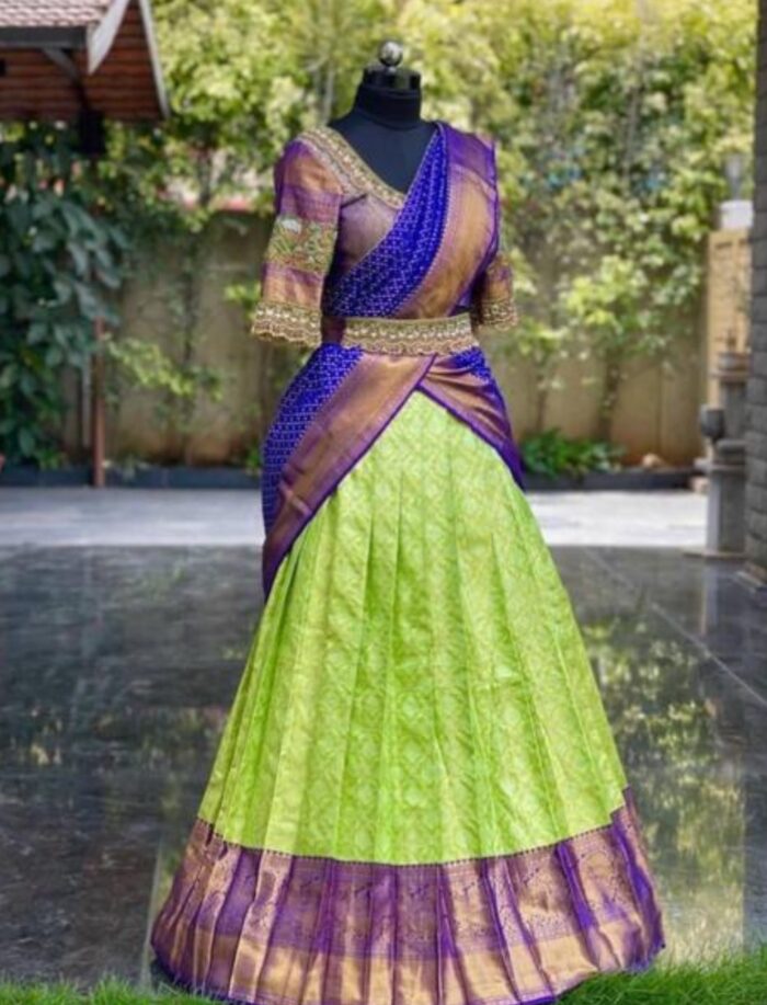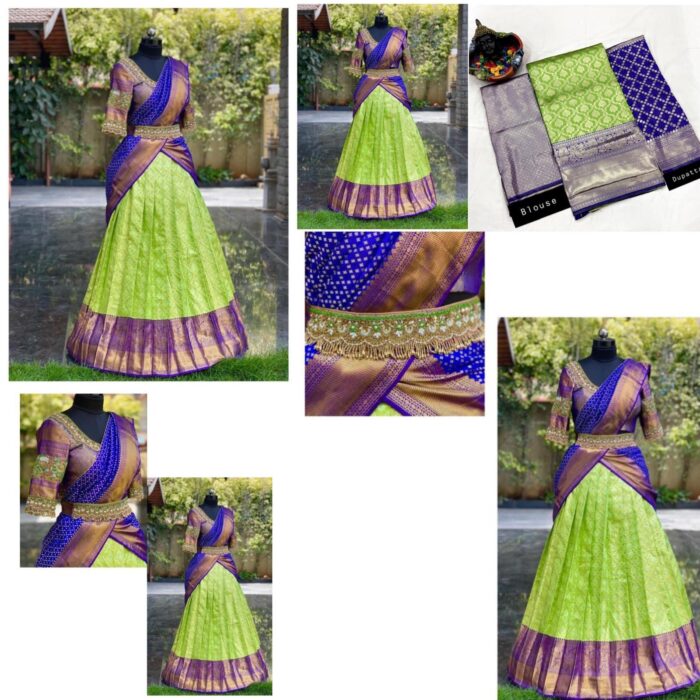 Blue and green kanchipuram silk zari half saree (lehenga choli and dupatta)