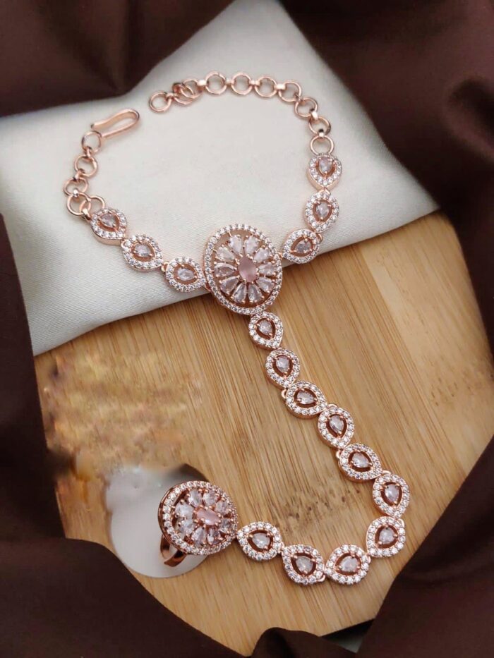 Elegant Rose Gold Hand Bracelet with Ring – Elevate your style with this exquisite rose gold hand bracelet attached to a delicate ring. Crafted with a sleek and modern design, this jewelry piece features intricate detailing, making it perfect for adding a touch of sophistication to any outfit. Ideal for weddings, parties, and special occasions, this hand bracelet with ring attachment exudes grace and elegance, complementing both traditional and contemporary looks