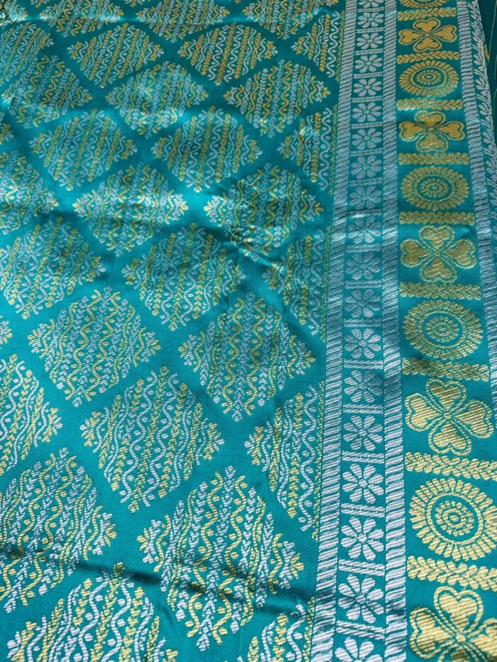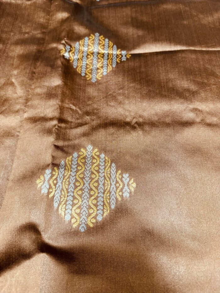 This exquisite Arani silk saree features a rich brown base with a stunning contrast of a teal pallu, creating a perfect blend of tradition and elegance. Adorned with intricate silver and gold embellishments throughout, the saree exudes timeless charm and sophistication, making it ideal for festive occasions, weddings, or special celebrations. The luxurious silk fabric adds to the drape and flow, ensuring a graceful and comfortable wear.
