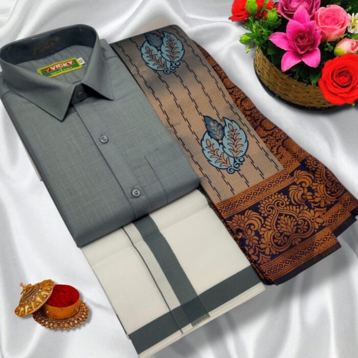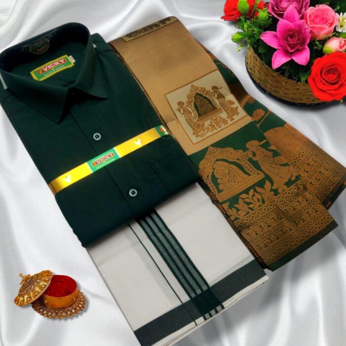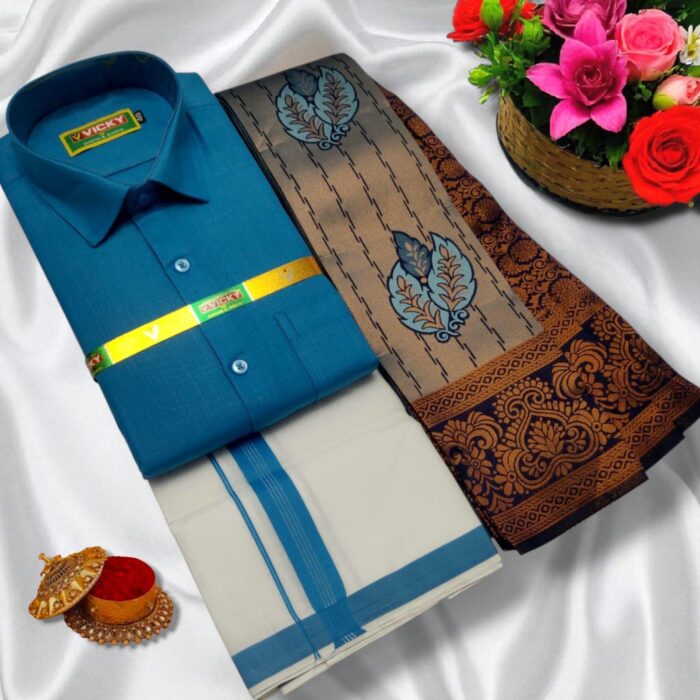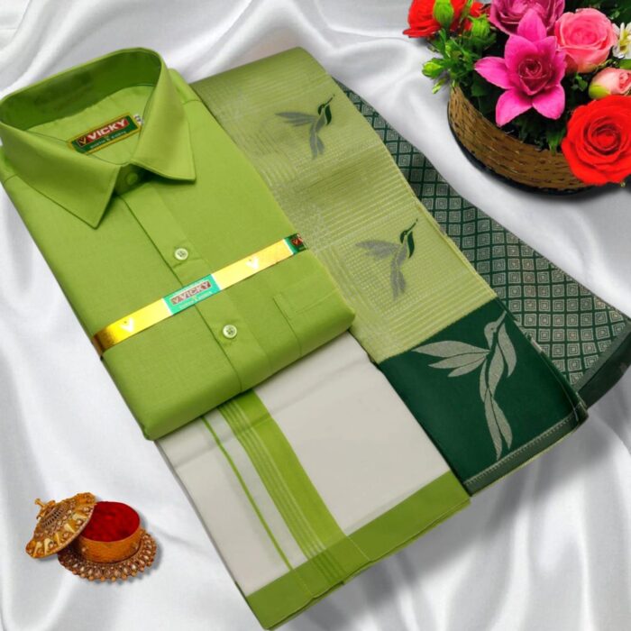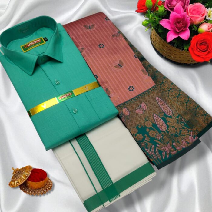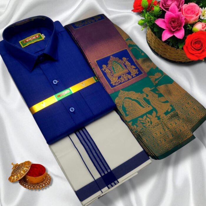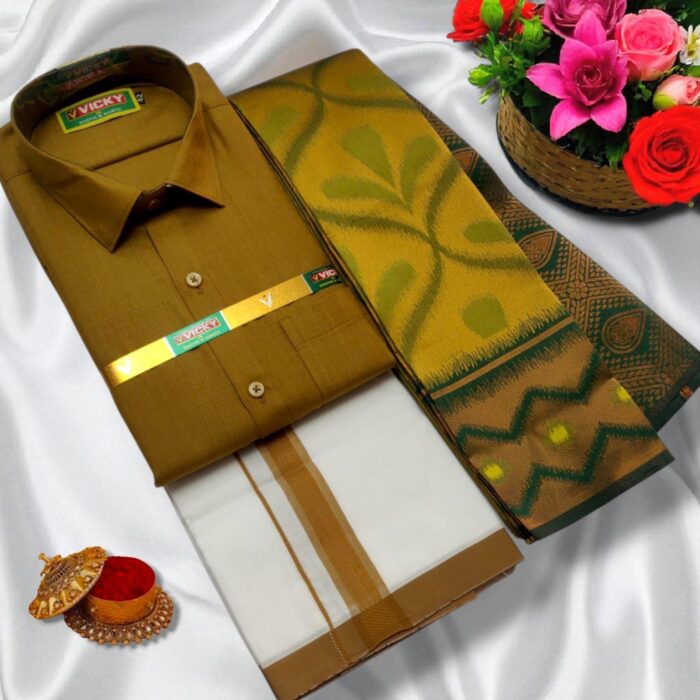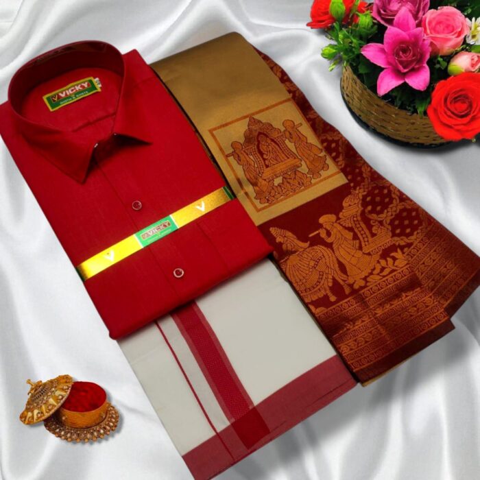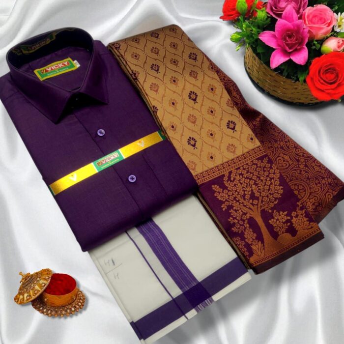 Couple Combo Of Cotton Shirt And Silk Dhoti With Silk Saree