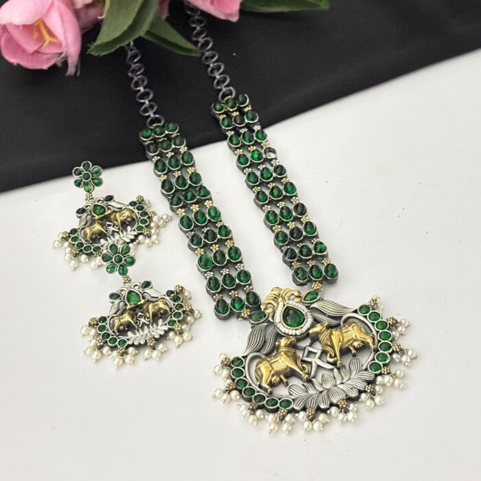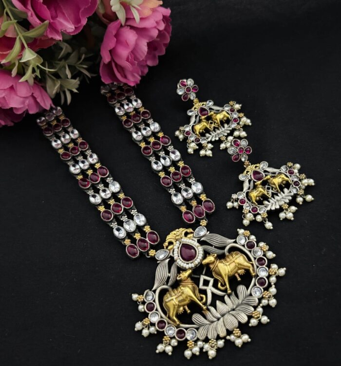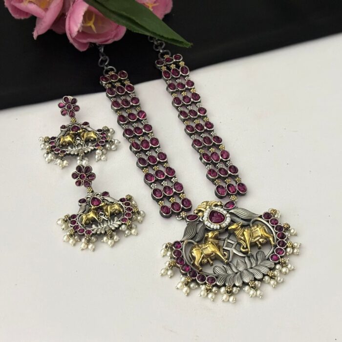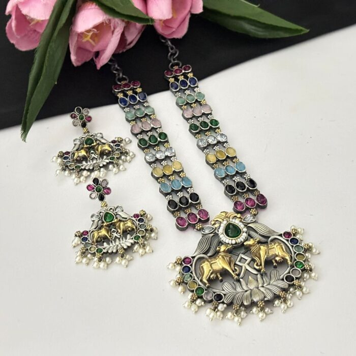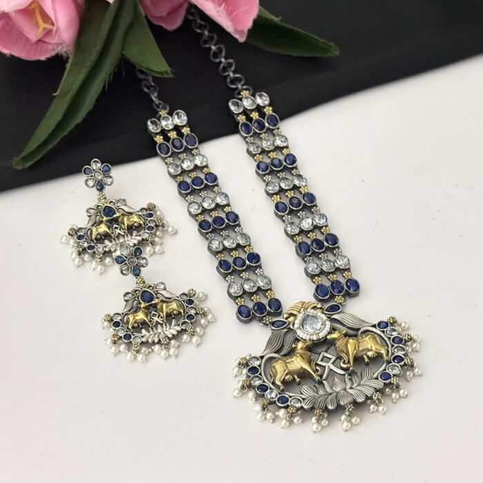Dual tone long necklace set with earrings
