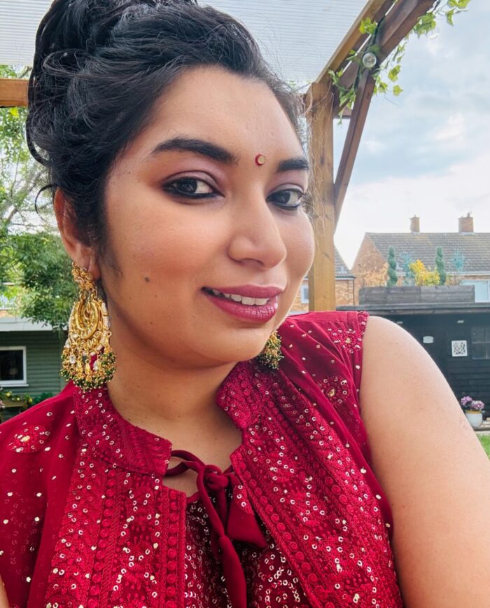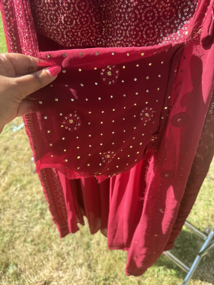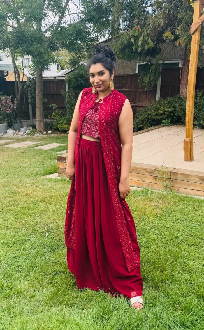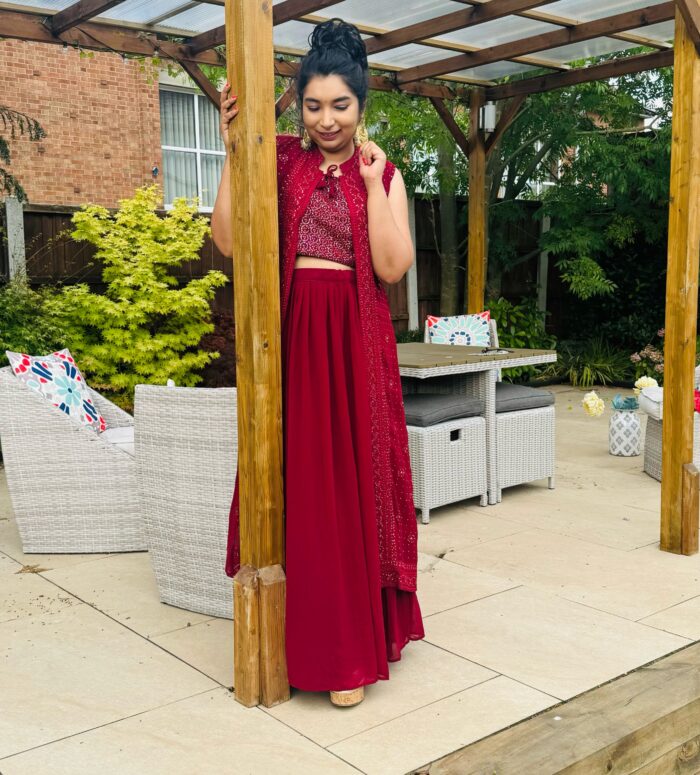A gorgeous gold and maroon Lehanga, with a tie up jacket. The jacket has short sleeves that can be attached. This has been paired with statement Kundan earrings.