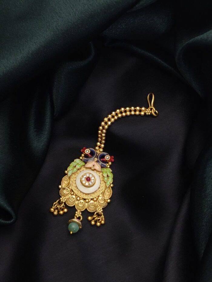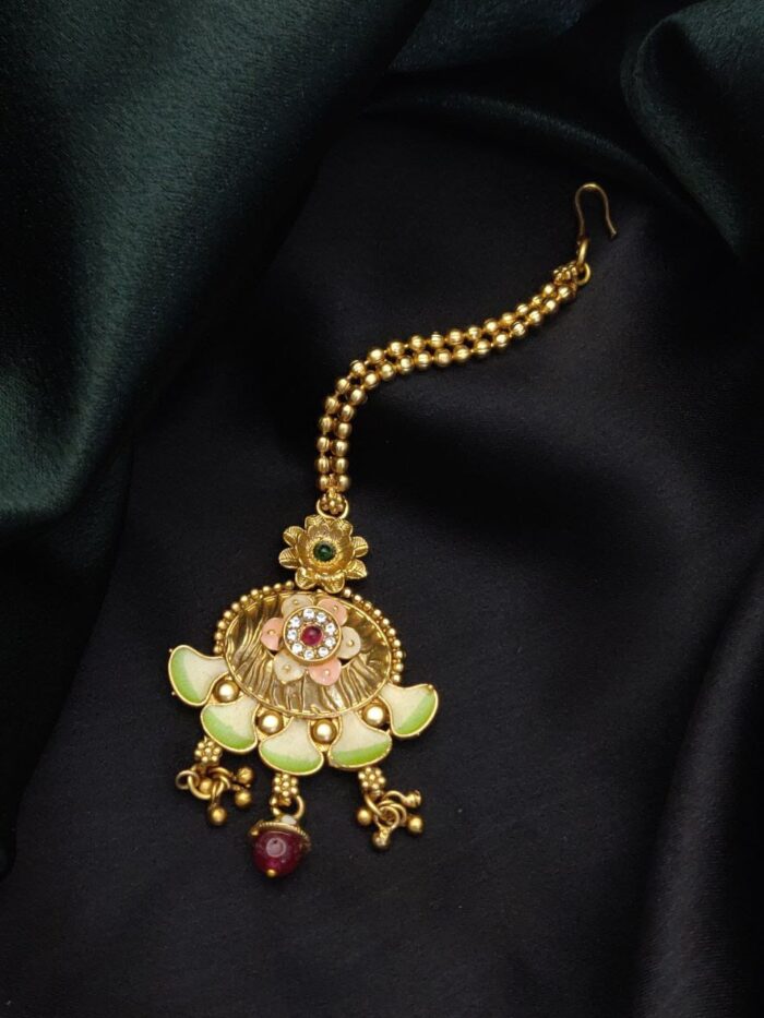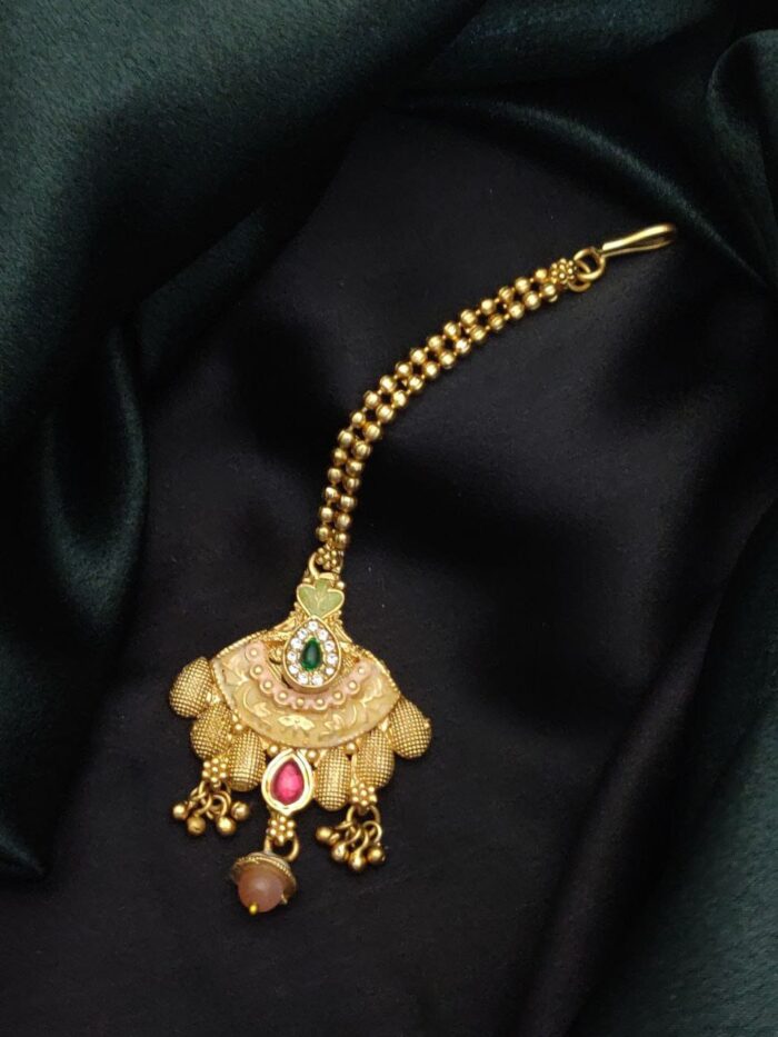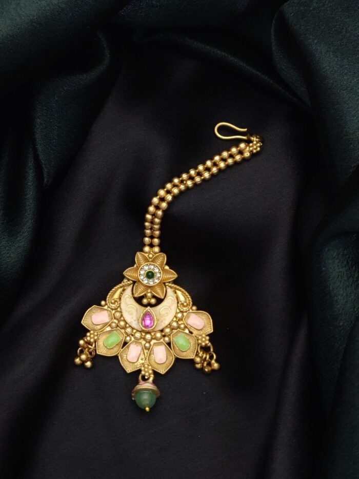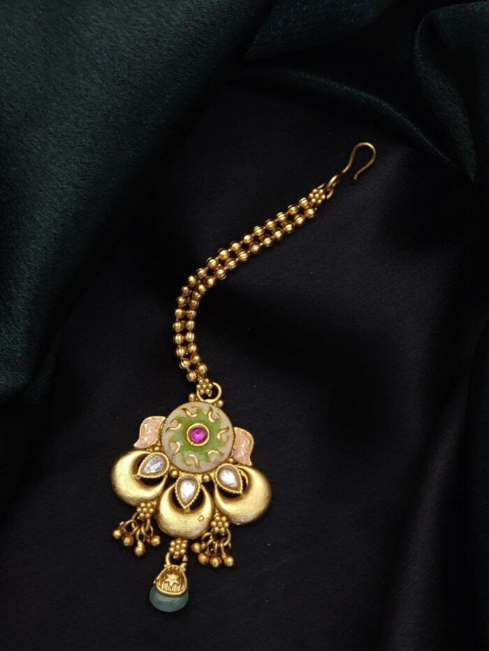 A maang tikka or head chain is a traditional piece of jewelry worn on the forehead by women, typically in South Asian cultures, especially in India. It consists of a pendant attached to a chain, with the chain placed along the hair parting and the pendant resting on the forehead, often at the hairline or just above the brows.