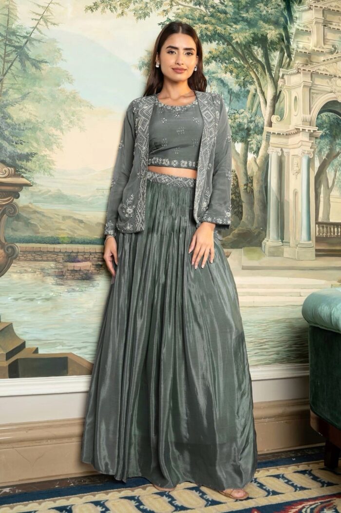 Heavy Handwork silk blend Grey crop top with jacket and pleated skirt