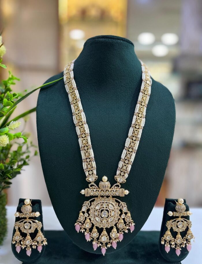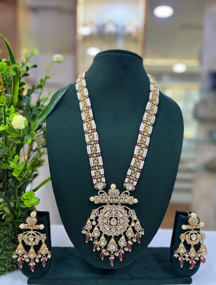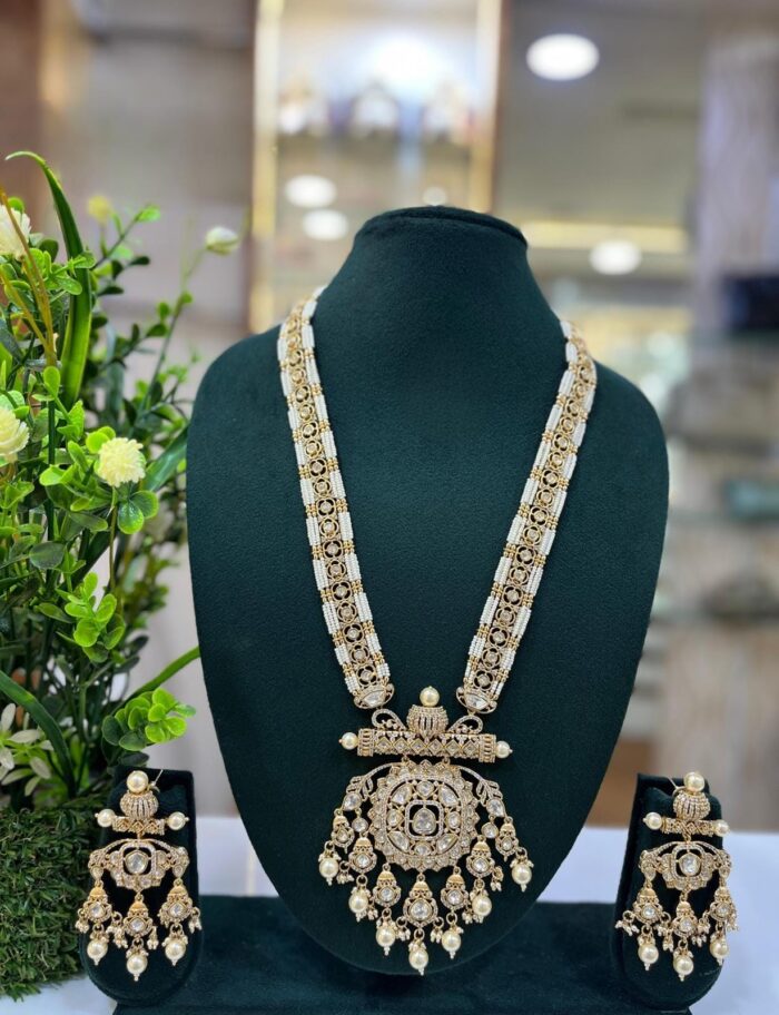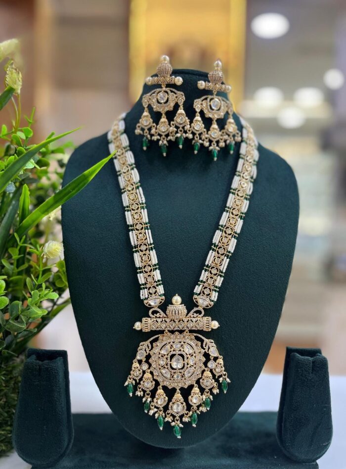 Moissanite Stone And Pearl Designer Wedding Long Necklace Sets