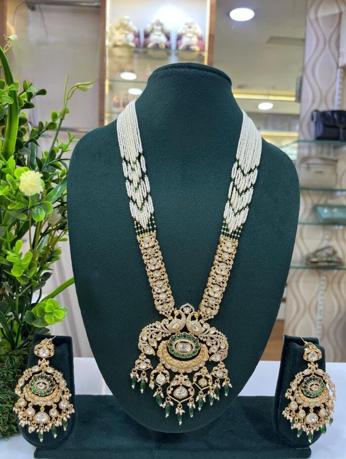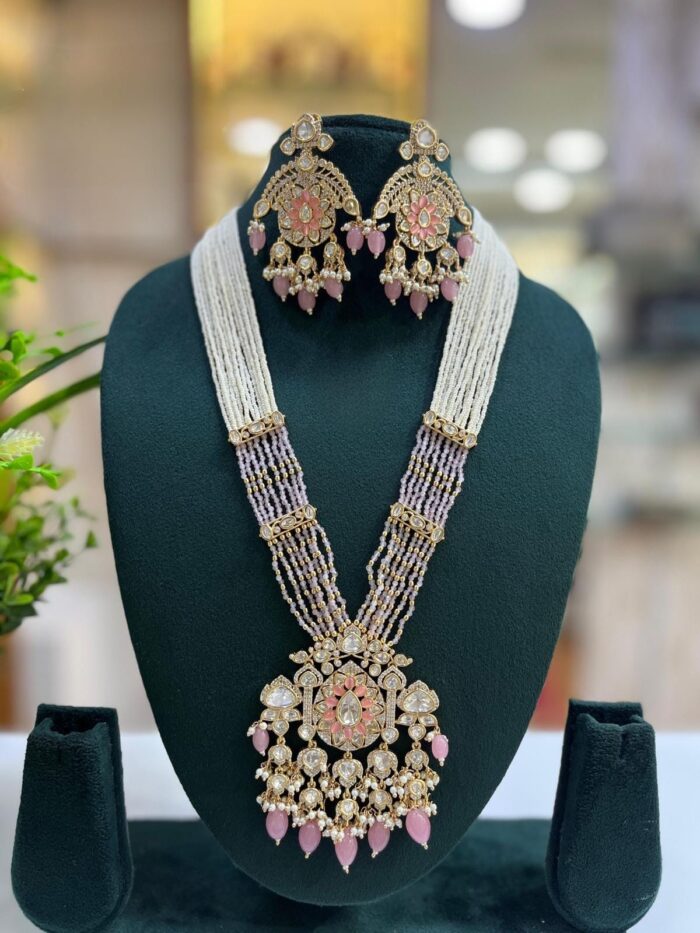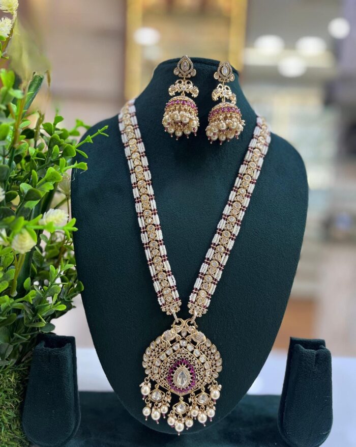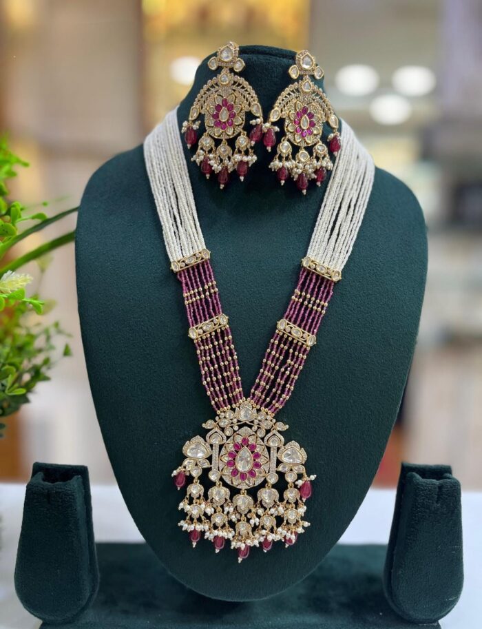 Moissanite Stone And Pearl Designer Wedding Long Necklace Sets With Large Pendants