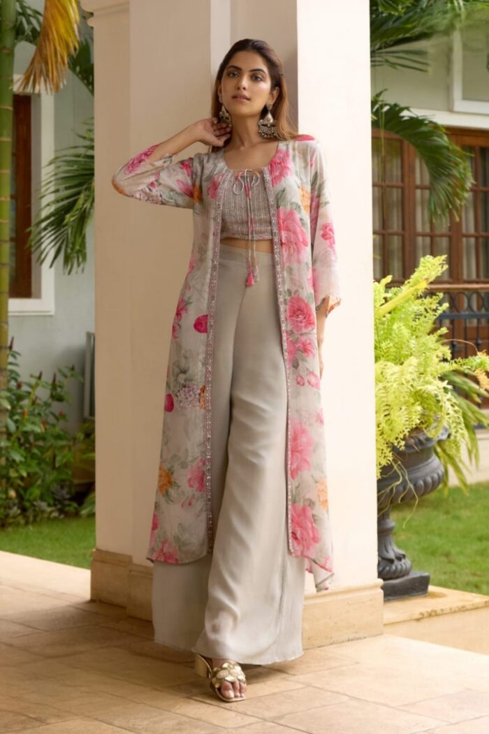 Palazzo Set, Top With Sequins Work And An Attractive Floral Printed Long Jacket