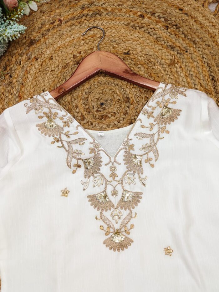 Flaunt the amazing White color of this suit in your upcoming festivities. The divine and luxurious fabric with Sequence, coding work gives it elegant look. It is decorated suit set With elegant banarasi jacquard dupatta and Neckline