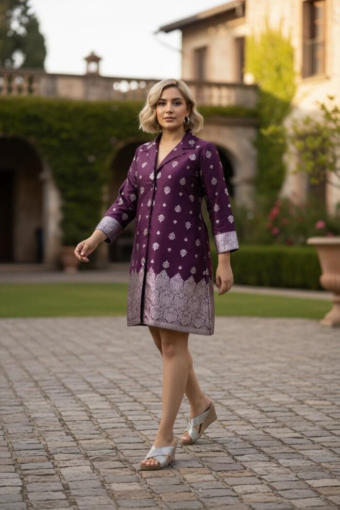 Wine and silver Banarasi Jacket dress