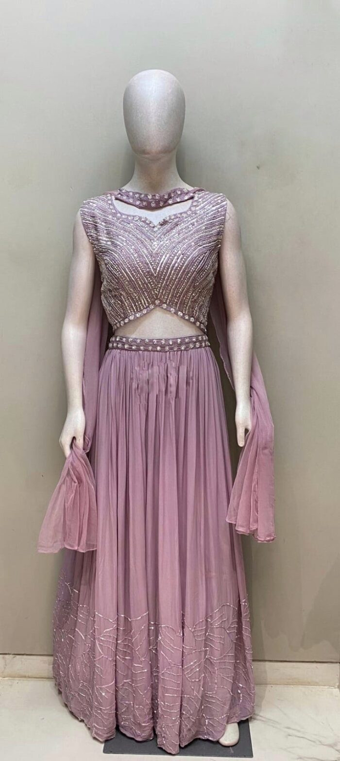 A stunning pink handworked crop top paired with a matching lehenga, designed to blend elegance with a modern silhouette. The intricate hand embroidery adds a touch of luxury, while the flowing lehenga creates graceful movement. Finished with a beautifully coordinated choker-style dupatta, this ensemble is perfect for festive celebrations, weddings, and special occasions where timeless charm meets contemporary style.