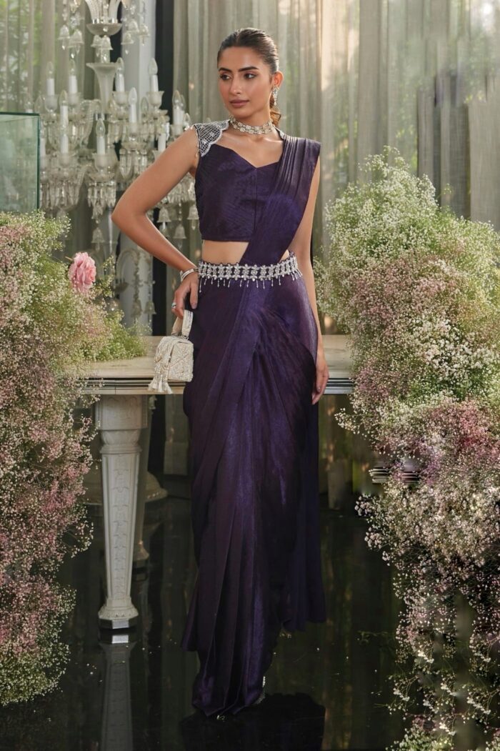 The Plum Perfect-Pre-Drape Saree exudes royal sophistication in a deep purple shade, designed for the modern woman who values both elegance and practicality. This ready to wear saree features a contemporary sleeveless blouse accentuated with handwork along the neckline and waist, creating a subtle yet luxurious shimmer. Crafted from fluid fabric, it offers effortless draping and a ready-to-wear design, making it an ideal choice for weddings, receptions, and evening galas where style meets convenience.