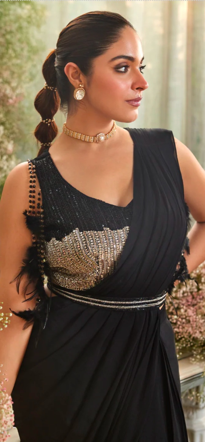 Step into the spotlight with our Shine On Ready to Wear Saree, designed for the modern woman who loves effortless elegance. Crafted in a rich black, this pre-stitched drape ensures a flawless look in minutes, eliminating the hassle of pleating. The statement blouse is adorned with handwork and playful fringe detailing, adding a glamorous edge to the timeless silhouette. A sleek waist belt cinches the look, enhancing your shape while adding a touch of contemporary charm. Perfect for cocktail nights, weddings, and festive soirées, this ready-to-wear saree blends comfort, style, and sophistication in one stunning outfit.