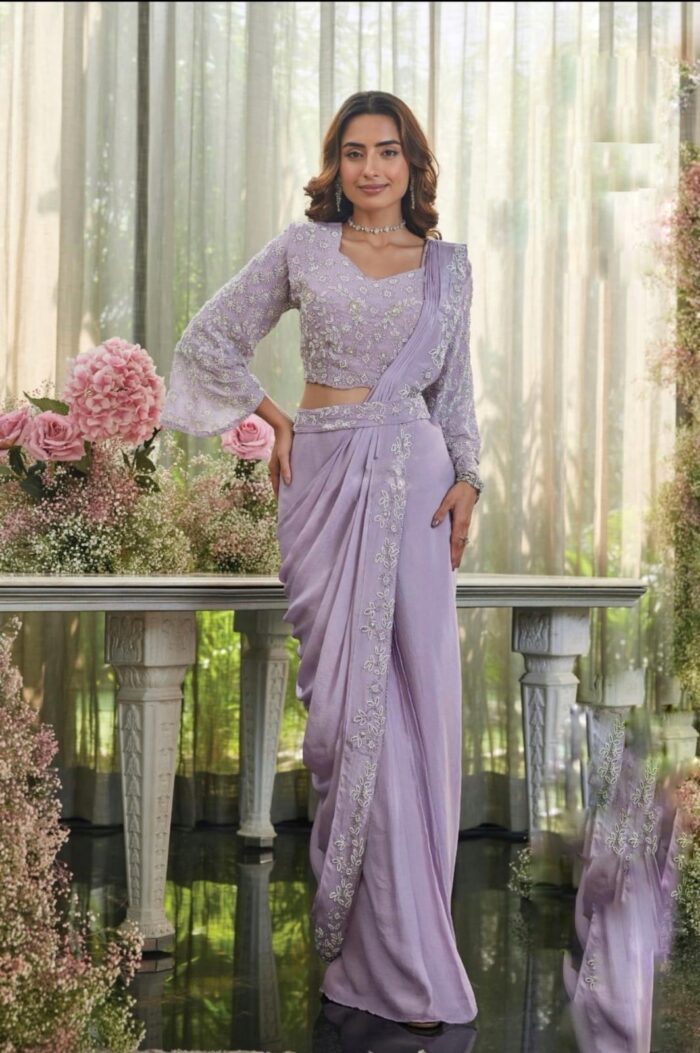 Graceful and effortlessly elegant, this lavender ready-to-wear saree is designed for modern comfort with a timeless touch. Crafted in a soothing pastel hue, the saree drapes beautifully and comes pre-stitched for easy wear, making it perfect for festive occasions and special gatherings. It is paired with a finely hand-worked blouse that adds a touch of artisanal charm and intricate detail, elevating the overall look. Soft, stylish, and sophisticated, this ensemble blends traditional craftsmanship with contemporary convenience.