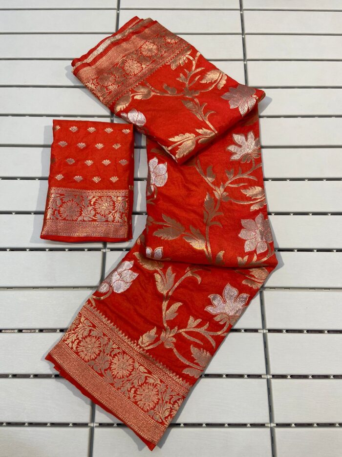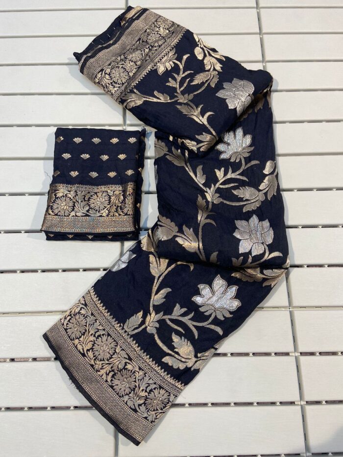 Pure soft khadi georgette silk saree with rich zari woven pallu, paired with fancy tassels. This saree features a heavy woven border with all-over zari and gota patti weaving throughout, accompanied by a running barcode blouse.