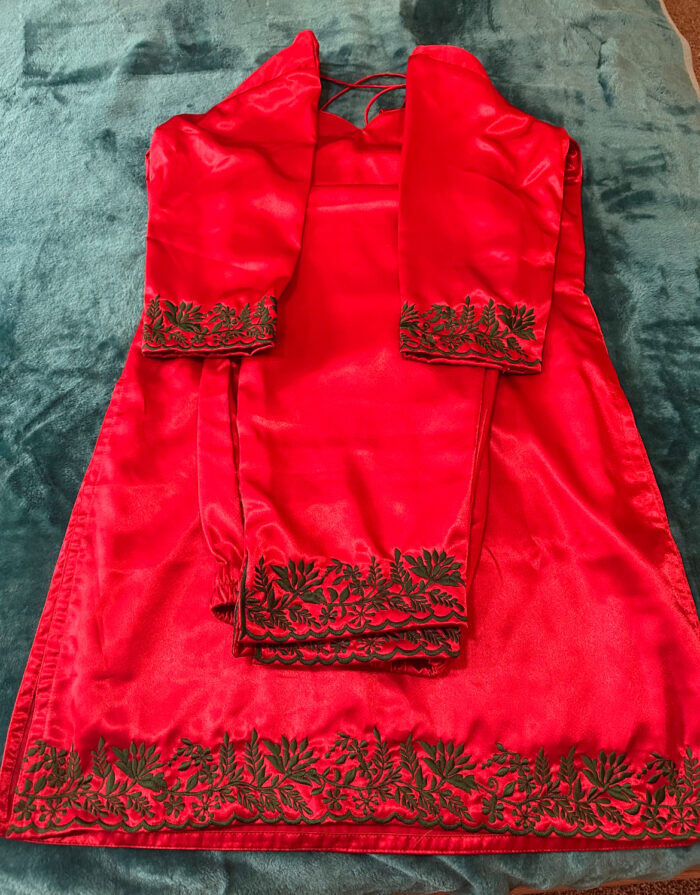 A unique look Designed by Wow Vastra, stunning satin coord set with hand embroidery, jazzed up by a statement necklace.