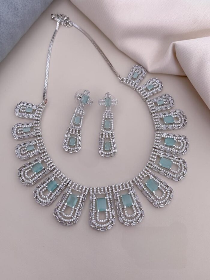 These American diamond stone necklace sets have stones that are synthetic or lab-created diamonds that mimic the appearance of natural diamonds