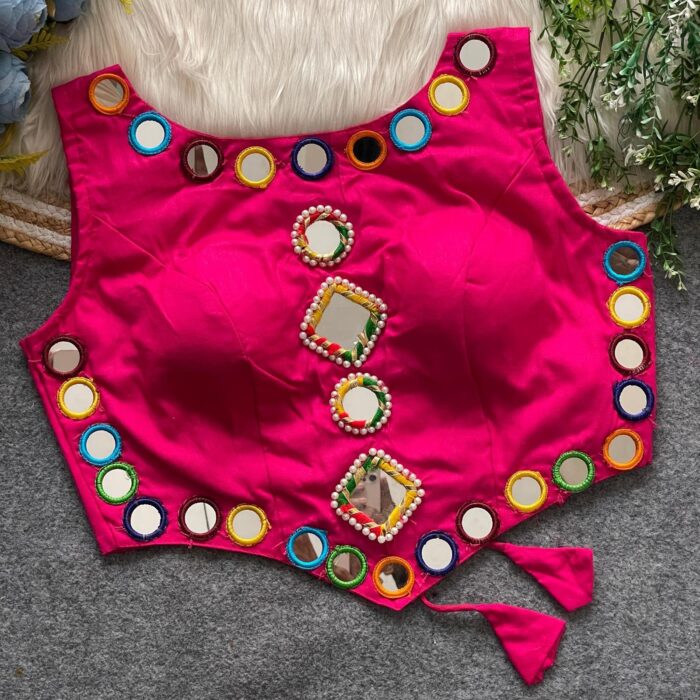 Sleeveless pink readymade blouse with mirror work