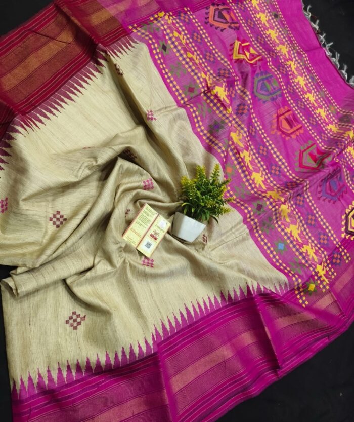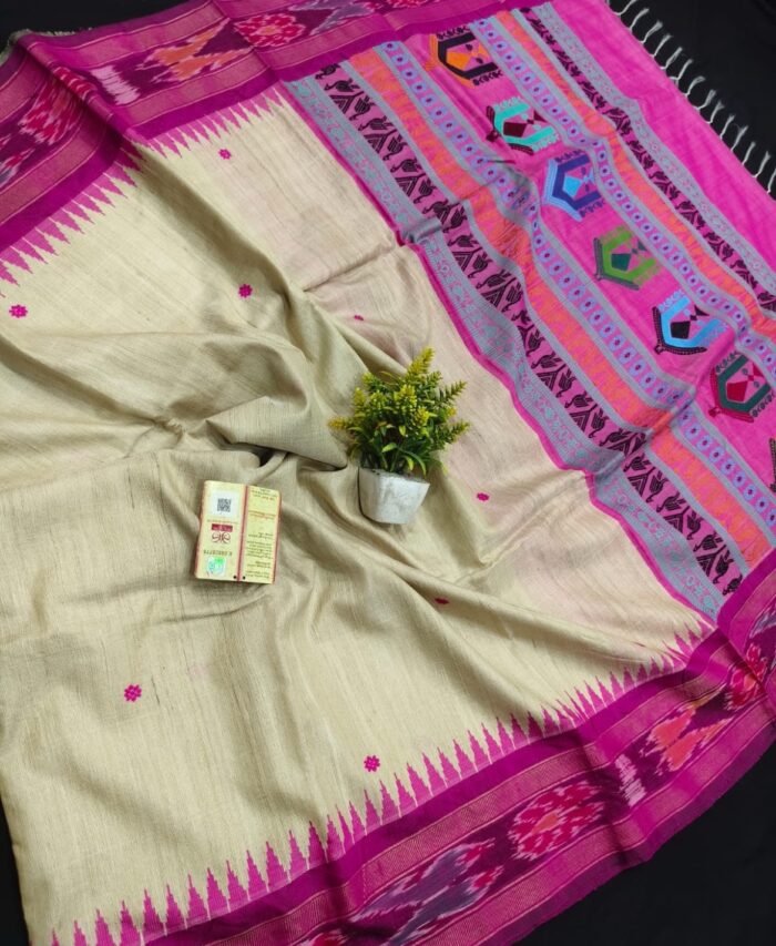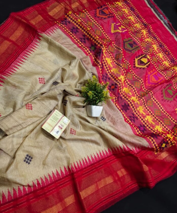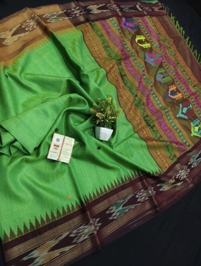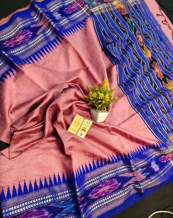 Tussar handloom both side temple border ,ikkat ,body buta pattern dolavedy saree with contrast pallu blouse