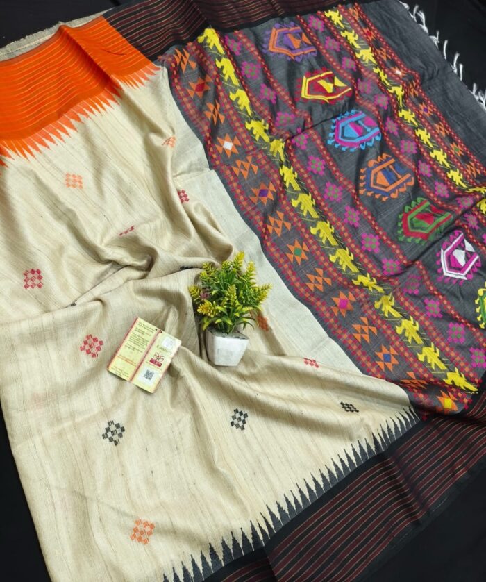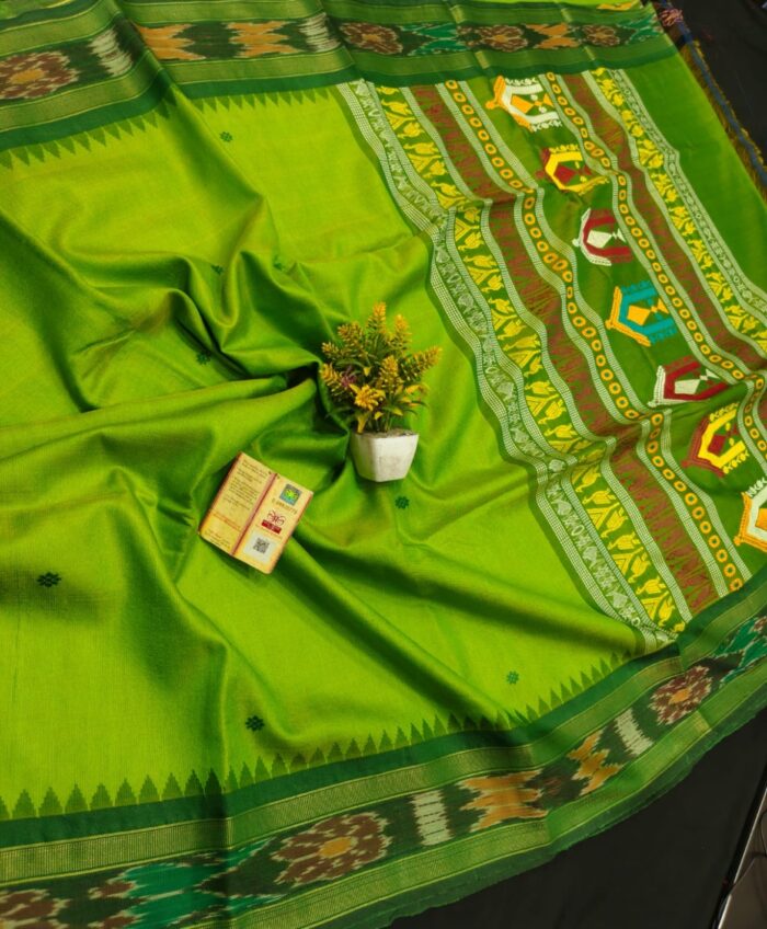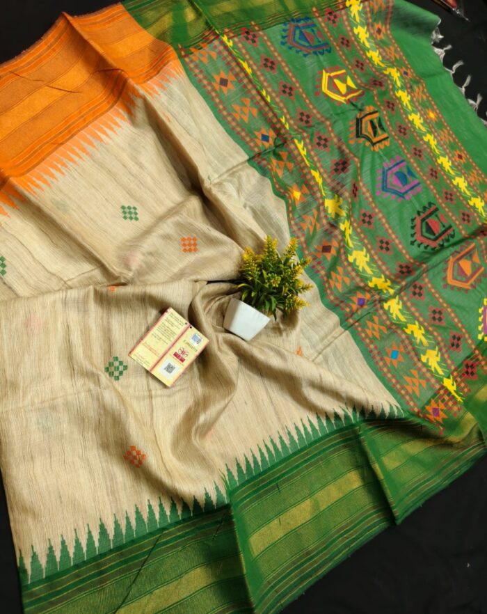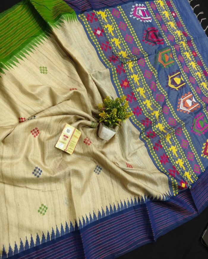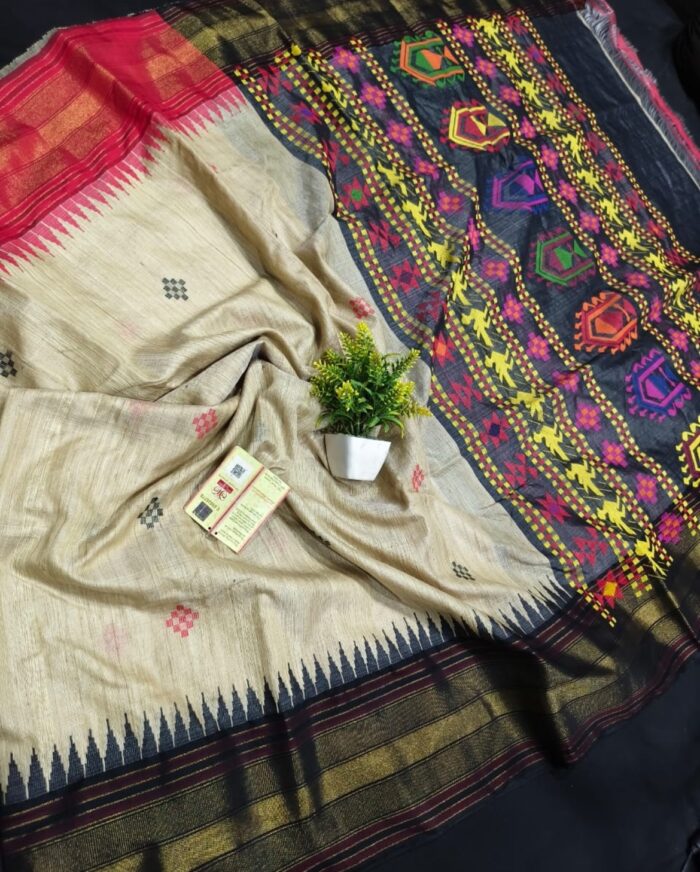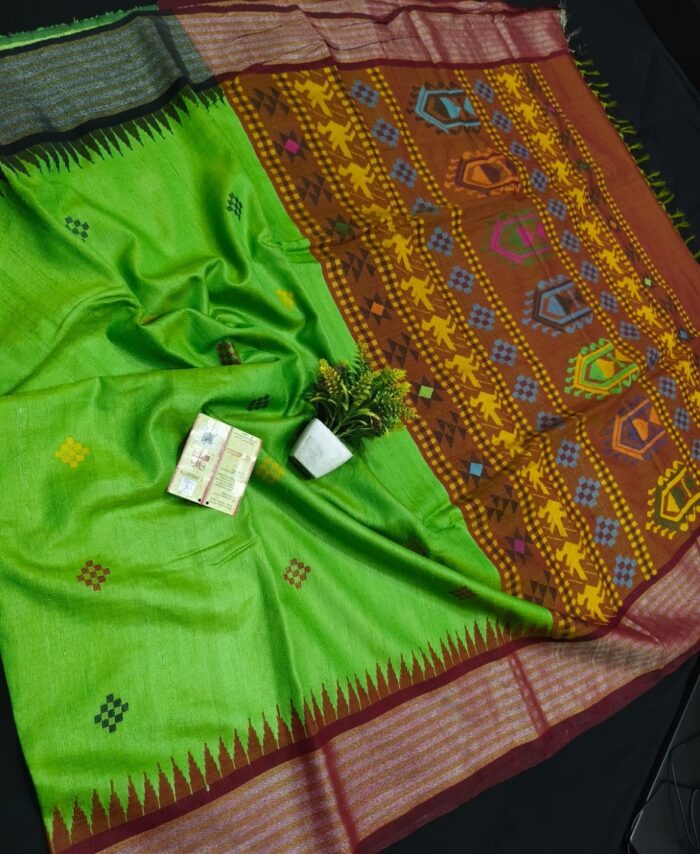 Tussar handloom both side temple border ,ikkat ,body buta pattern dolavedy saree with contrast pallu blouse