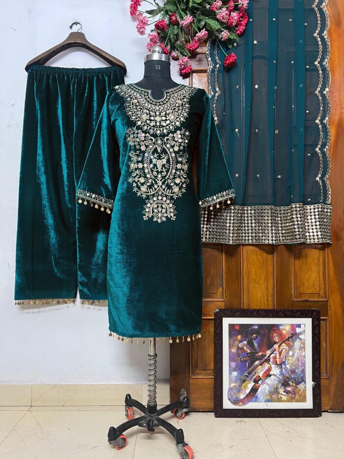PRESENTING NEW DESIGNER BEAUTIFUL KURTI-PLAZZO SET IN HEAVY VELVET FABRIC WITH SEQUINS EMBROIDERY WORK