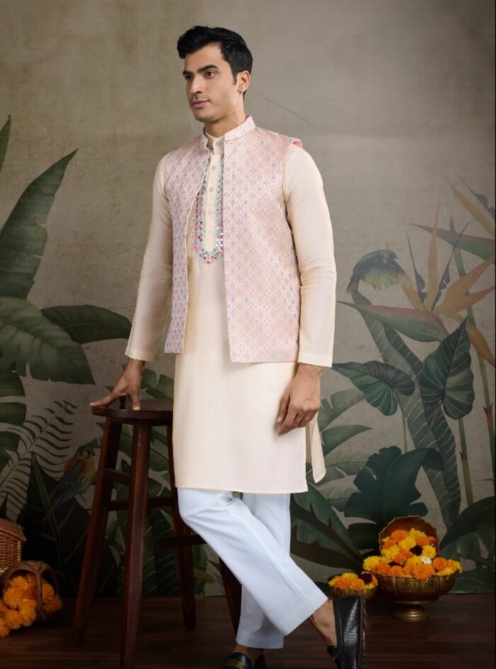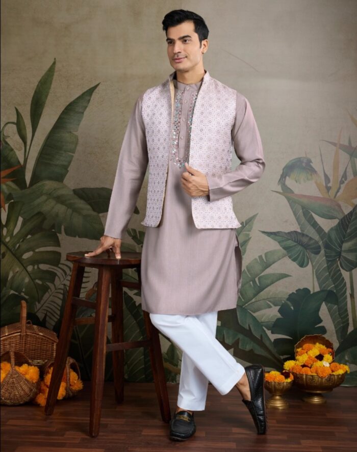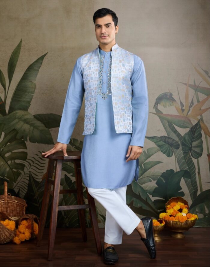 Viscose silk kurta pajama and waist coat set with mirror and thread work